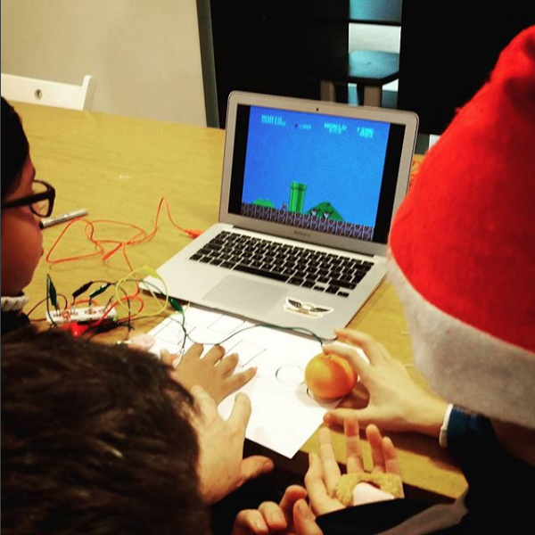 We’re making a circuit with ourselves and the kids here. The orange is one of the controllers for the game. All made by folks 7-10 years old.